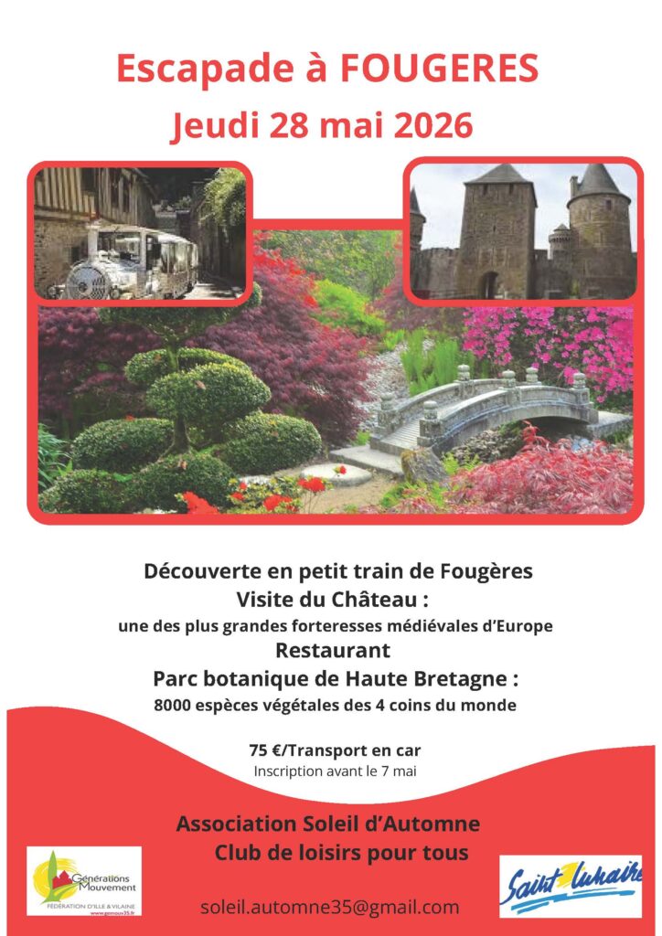 Le jeudi 28 mai 2026, notre association vous propose une belle sortie conviviale à la découverte de Fougères, cité de caractère réputée pour son riche patrimoine historique et ses magnifiques espaces naturels.