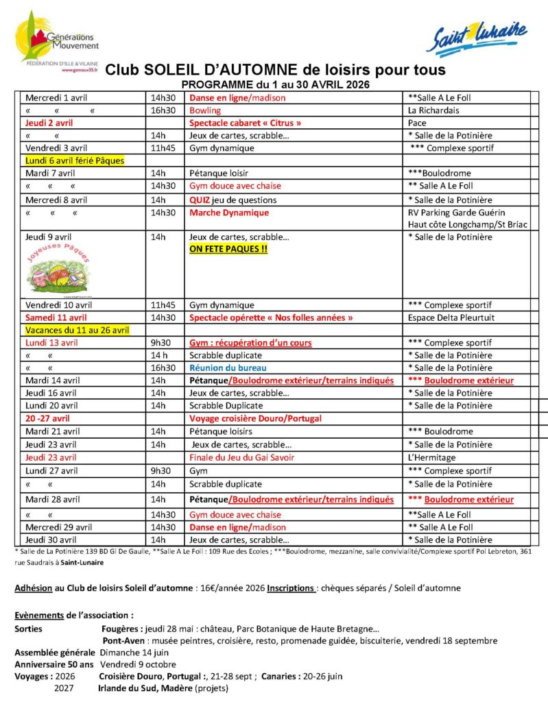 Courrier : Mairie, Association Soleil d’Automne, Bd Flusson, 35800 -Saint-Lunaire